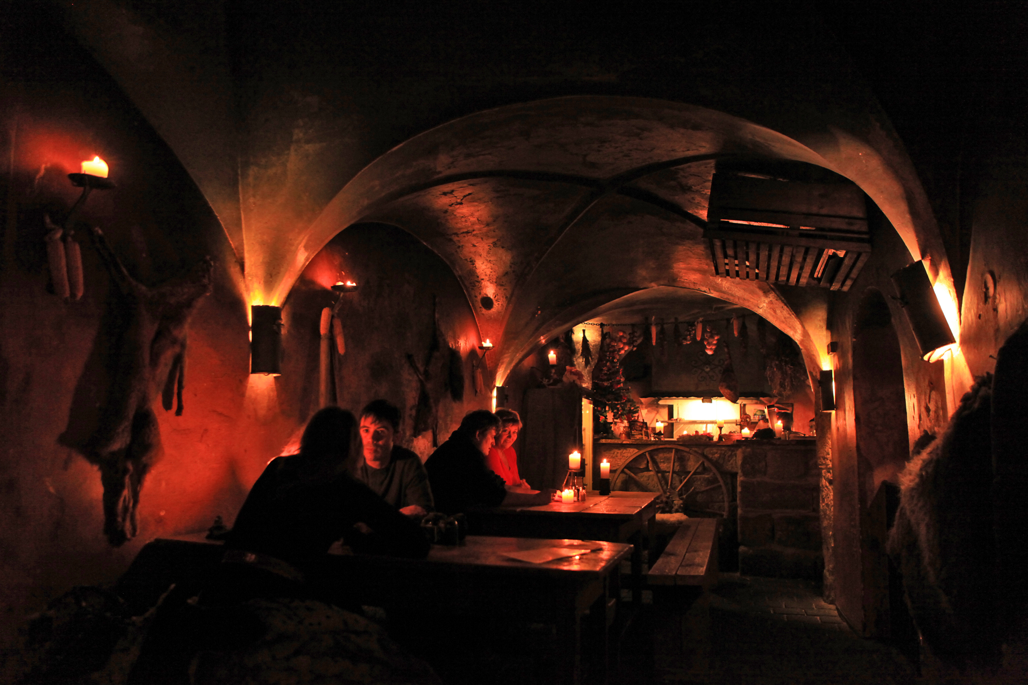La taverne est un véritable cliché ambulant. Située dans un bâtiment typiquement tchèque, lui-même sis dans une rue à l’atmosphère on ne peut plus est-européenne, elle est dotée d’un décor tout en bois qui a vu passer les années. Crânes, chandelles, trésors médiévaux, cavernes et voûtes confèrent à ce lieu légendaire une ambiance très particulière et franchement fascinante. Un décor tout droit sorti d’un film