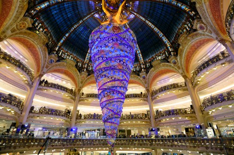 Cette année, les Galeries Lafayette bousculent les codes féériques habituels de cette période de l’année, elles ont fait appel à des monstres qui ont renversé le sacro-saint sapin et envahi ses vitrines. La coupole centenaire des galeries accueille un immense arbre de Noël de 25 mètres, coloré, dont les racines s’ancrent dans son dôme aérien.