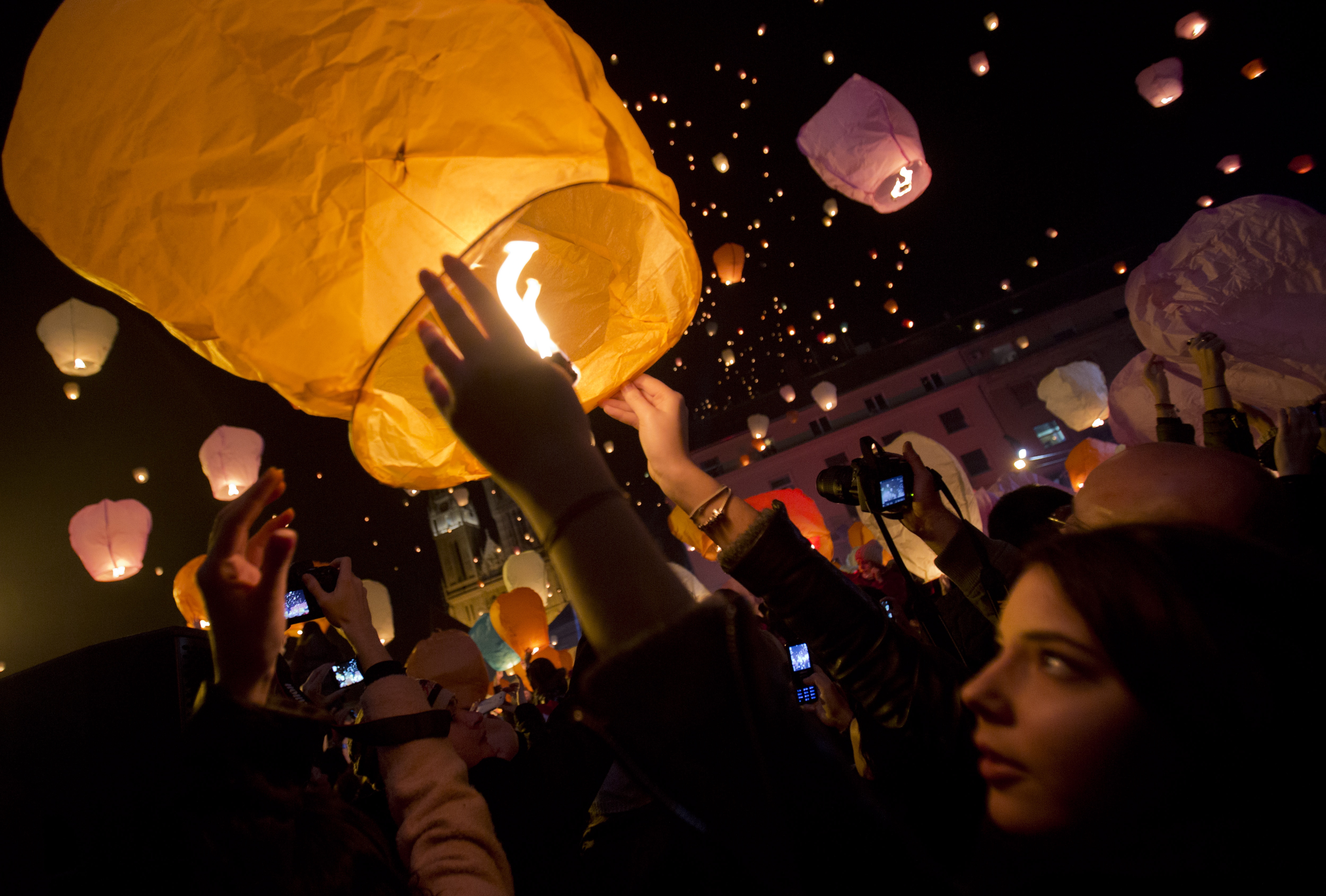 Lundi, des gens de Zagreb ont libéré des lanternes de papier dans le cadre de festivités de Noël.