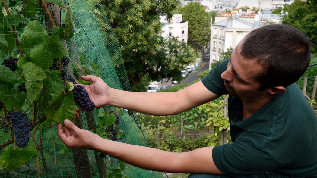 Accrochés à flanc de colline dans un petit jardin municipal du nord-est de la capitale, les 230 pieds de vigne ont une vue imprenable sur le Sacré-Cœur au loin.