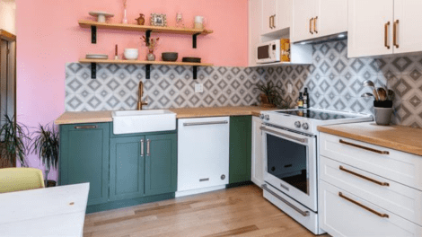 L’espace, d’environ 900 pieds carrés, comporte un beau balcon, qui donne vue sur des arbres, ainsi qu’un grand rangement extérieur. La cuisine, moderne, attire l’œil avec ses motifs et son pop de rose sur le mur.