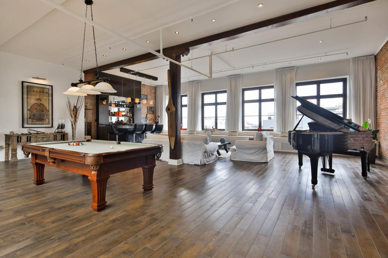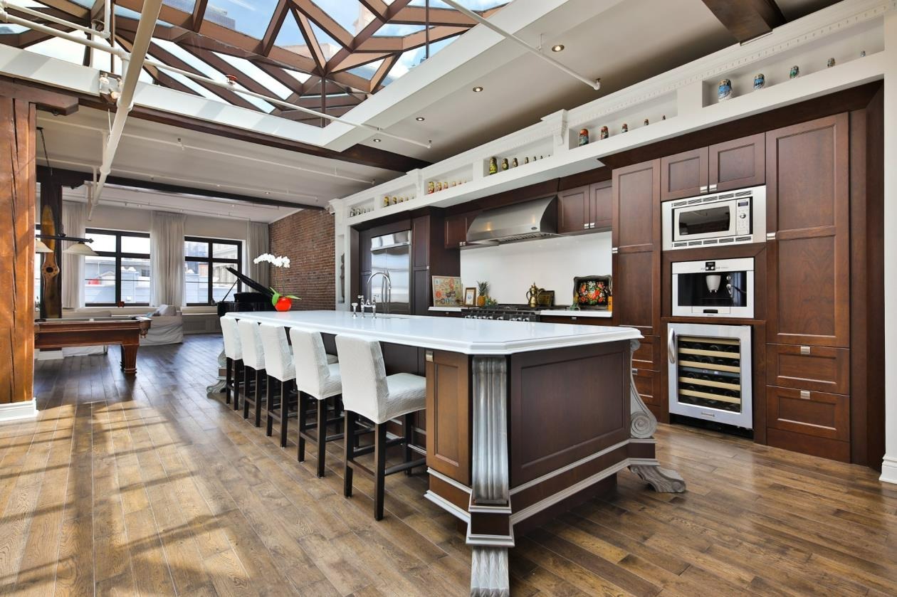 L’immense pièce à vivre, très lumineuse grâce à quatre grandes fenêtres et un puits de lumière, est assez grande pour inclure un bar, plusieurs canapés, une table de billard, un piano à queue et une vaste cuisine avec un îlot central de 16 pieds de long.