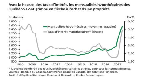 «Avec une mise de fonds de 10 % et un amortissement de 25 ans, les mensualités hypothécaires ont bondi, en moyenne, à 2 550 $ à la fin de 2022 par rapport au creux de 1 350 $ atteint au cours des six premiers mois de la pandémie il y a deux ans. Il s’agit d’une augmentation de plus de 1 000 $ par mois», peut-on lire dans le document.