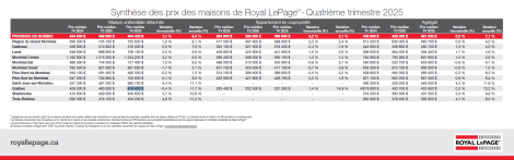 Selon le dernier rapport trimestriel de Royal LePage, le prix d’une maison unifamiliale a augmenté de 1% au quatrième trimestre de 2025, par au trimestre précédent. Ceci représente une augmentation de 8,1% par rapport à 2024.