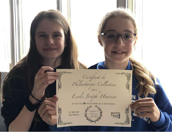 Au terme de la campagne, en plus de remettre un montant de 2720 $ aux jeunes entrepreneurs, le partenaire a donné aux élèves plus de 600 sachets de soupe, qu’ils ont offert à la paroisse de Sainte-Anne-de-Bellevue, laquelle leur a remis un certificat de philanthropie collective.