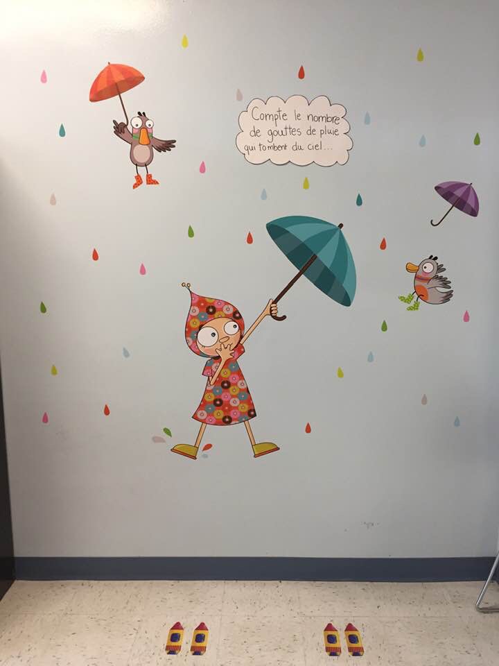 «Les créatrices du projet ont voulu créer un espace où il serait amusant de bouger tout en apprenant. Un parcours sur le plancher travaille la motricité globale, mais il y aussi des activités sur les murs comme de s’étirer pour toucher les nuages ou pousser le mur. Un jeu permet de travailler le calcul en compter les gouttes de pluie», indique la directrice, Johanne Landry.