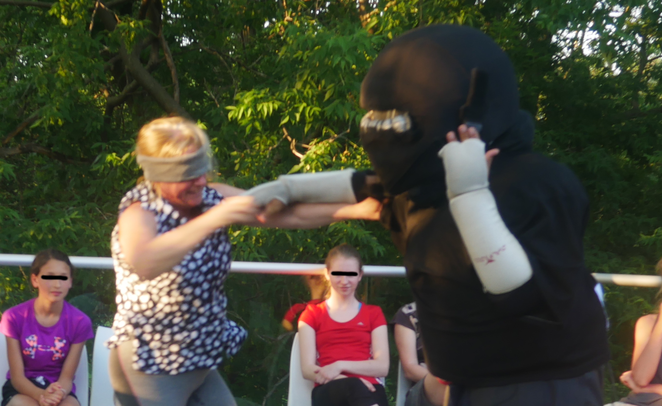 M. Manoli et son fils David, qui est également instructeur en autodéfense, mettent en scène des situations totalement inattendues pour les participantes.