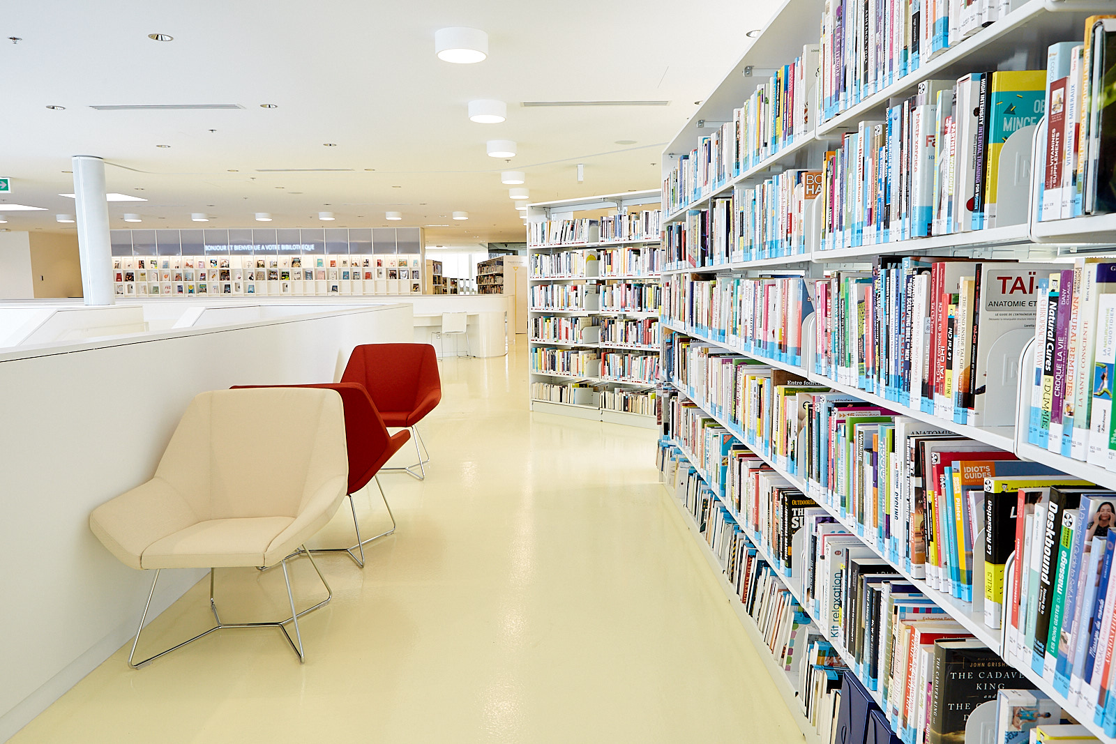 Avec un kiosque qui peut facilement être démonté, la zone d’accueil a été aménagée de façon à pouvoir permettre des prestations de troupes de cirque. Aussi, la nouvelle bibliothèque utilise un système de classification des livres de type hybride, une première au Québec.