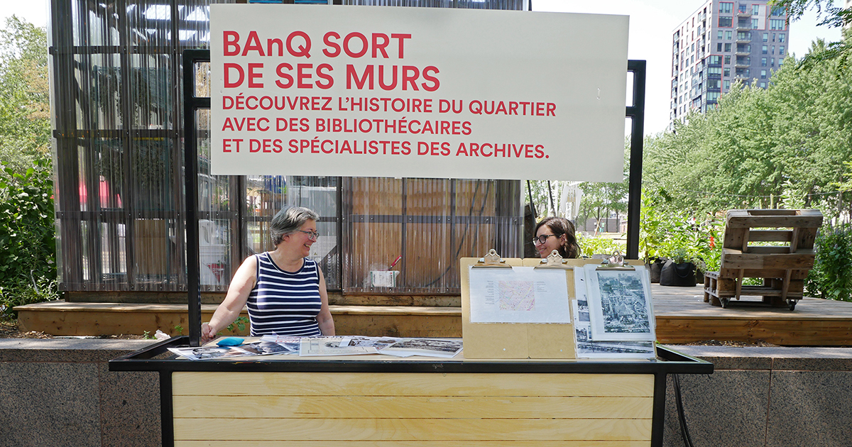 Jusqu’au 21 septembre, tous les mardis, BAnQ sort quelques-unes de ses archives de façon à les rendre disponibles aux yeux des passants. Derrière un kiosque, plusieurs bibliothécaires présentent les documents, dont le thème change chaque semaine. Parallèlement, une exposition se déroule sur la rue Sainte-Catherine, dans laquelle trois artistes exposent des illustrations créées à partir d’anciennes photographies de la ville.