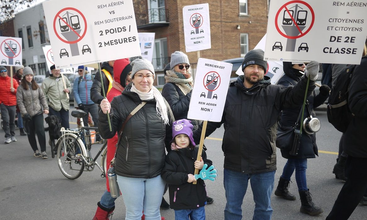 Alors que CDPQ-Infra tenait des rencontres de relations publiques pour répondre aux questions des citoyens dans trois lieux publics de l’Est de Montréal, une manifestation organisée par le Collectif en Environnement Mercier-Est (CEM-E) se mettait en marche pour exprimer leur farouche opposition au tracé aérien du projet de REM de l’Est.