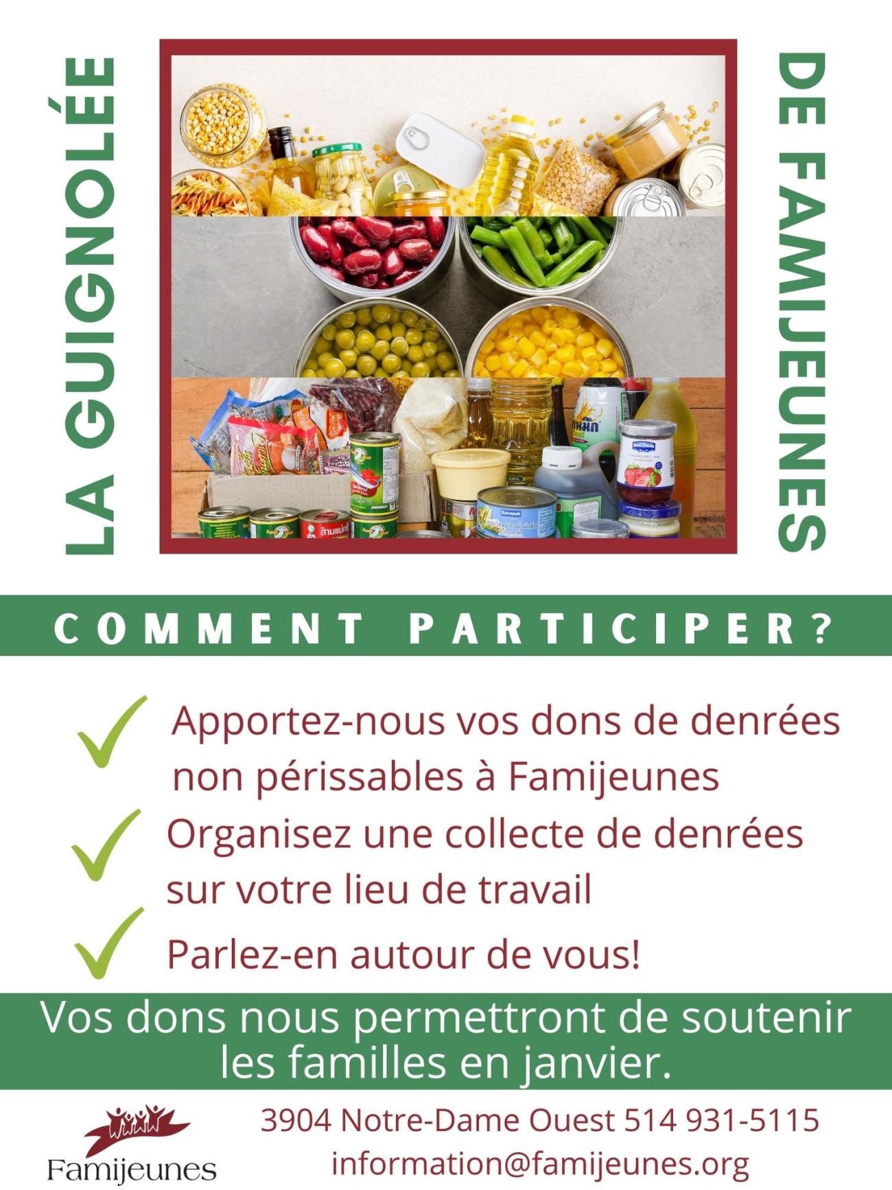 De son côté, l’organisme communautaire Famijeunes lance sa guignolée annuelle et invite la population à fournir des denrées non périssables à l’accueil de Famijeunes au 3904 Notre-Dame Ouest.