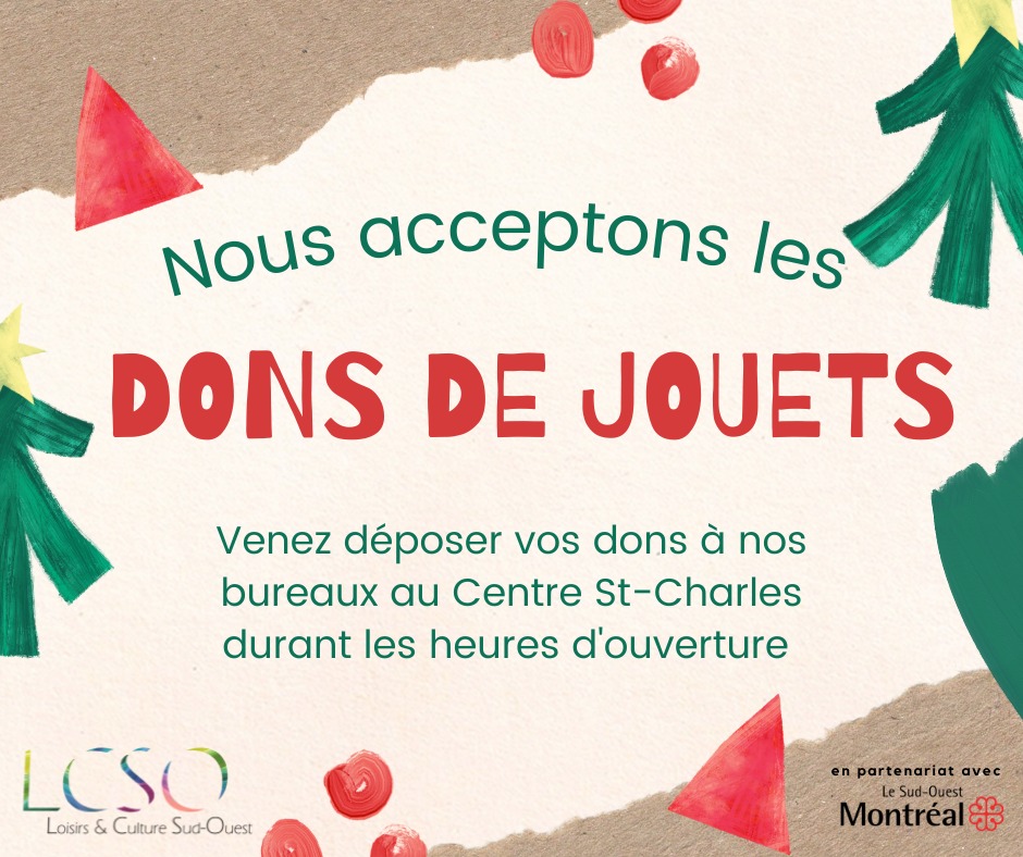 L’organisme Loisirs et Culture Sud-Ouest (LCSO) organise une collecte de jouets en vue d’offrir des jouets lors de l’événement de Noël qui se tiendra le 19 décembre prochain.