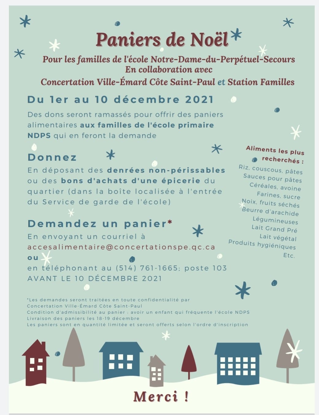 Les parents de l’Organisme de Participation de Parents (OPP) de l’école Notre-Dame-du-Perpétuel-Secours (NDPS) souhaitent offrir des paniers alimentaires aux familles de l’école NDPS qui en feront la demande.