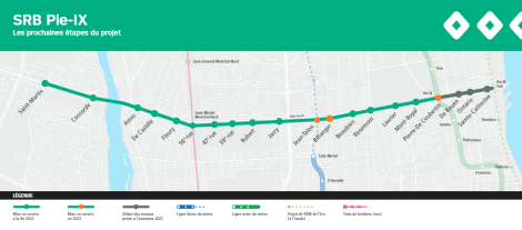 Il est prévu que le SRB Pie-IX soit en service à la fin de l’année 2022 dans la majorité des secteurs situés entre l’avenue Pierre-De Coubertin à Montréal et le boulevard Saint-Martin à Laval, à l’exception du secteur de la rue Jean-Talon, où les travaux se poursuivront tels que planifiés jusqu’à l’automne 2023.