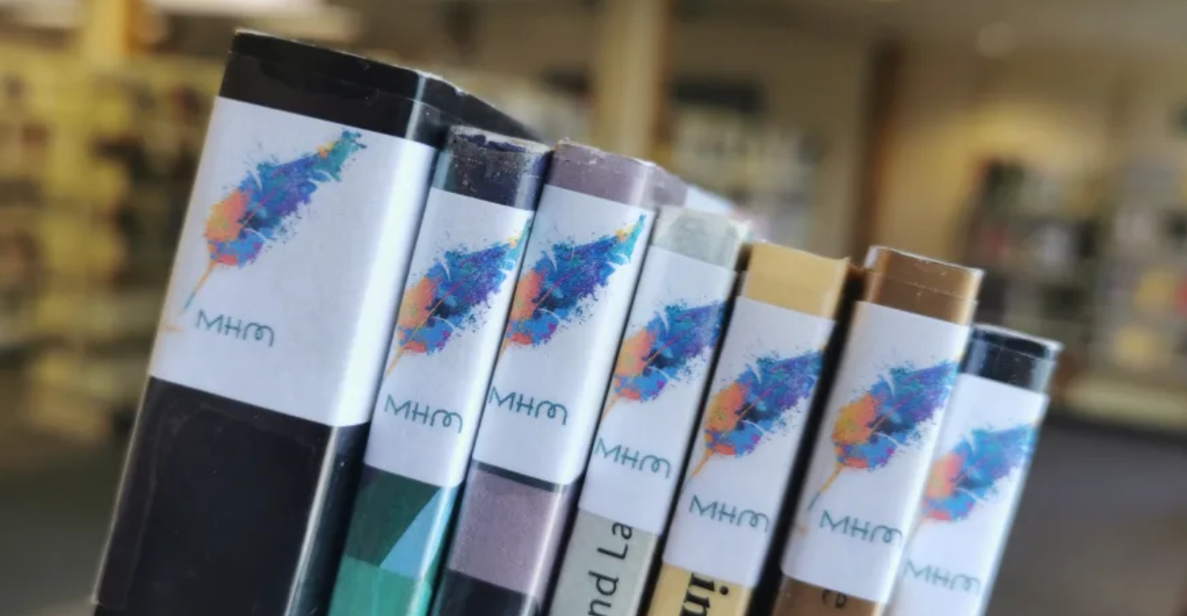 Avec cette collection, la bibliothèque Maisonneuve veut mettre l’emphase sur les talents locaux et donner une vitre aux autrices et auteurs de Mercier–Hochelaga-Maisonneuve, qui sont différenciés des autres auteurs grâce à un petit pictogramme de plume, comme en photo ci-dessus.