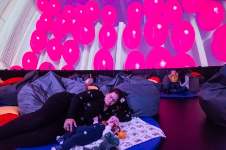 Sur place, premier constat, des tables à langer, des poubelles à couche et des espaces pour les poussettes ont été aménagés pour permettre aux parents de profiter au maximum de la projection sphérique sur 360 degrés. Des poufs et des blocs sont également disposés un peu partout dans la salle, l’ameublement idéal pour s’étendre et regarder les images défilant sous ses yeux, bébé couché sur soi.