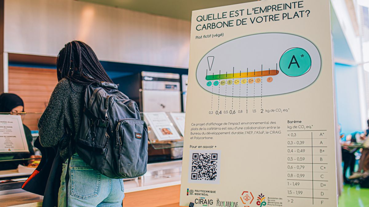 La Polytechnique, située à Côte-des-Neiges, proposera aux clients de sa cafétéria un affichage qui leur permettra de visualiser directement l’impact environnemental du plat qu’ils consommeront. Une note affichée chaque jeudi sur un tableau devant le point de service sera associée à l’empreinte carbone qu’a nécessitée la confection du repas.