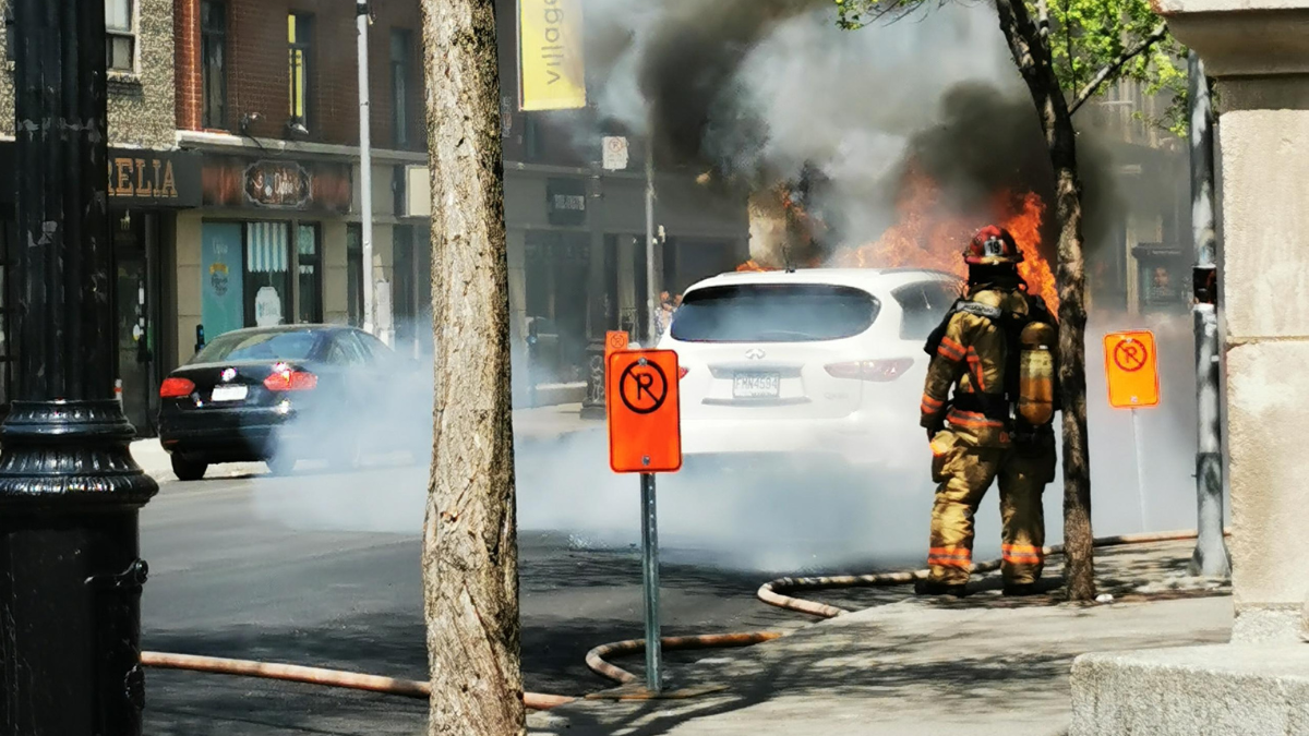Un VUS blanc situé sur la rue Sainte-Catherine près de l’intersection Plessis a été la proie des flammes dans le Village en début d’après-midi jeudi.