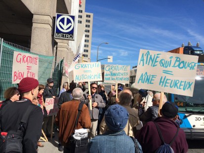 Plusieurs personnes âgées se sont rassemblées lundi devant la station de métro Crémazie pour demander la gratuité du transport en commun pour les aînés à Montréal.
