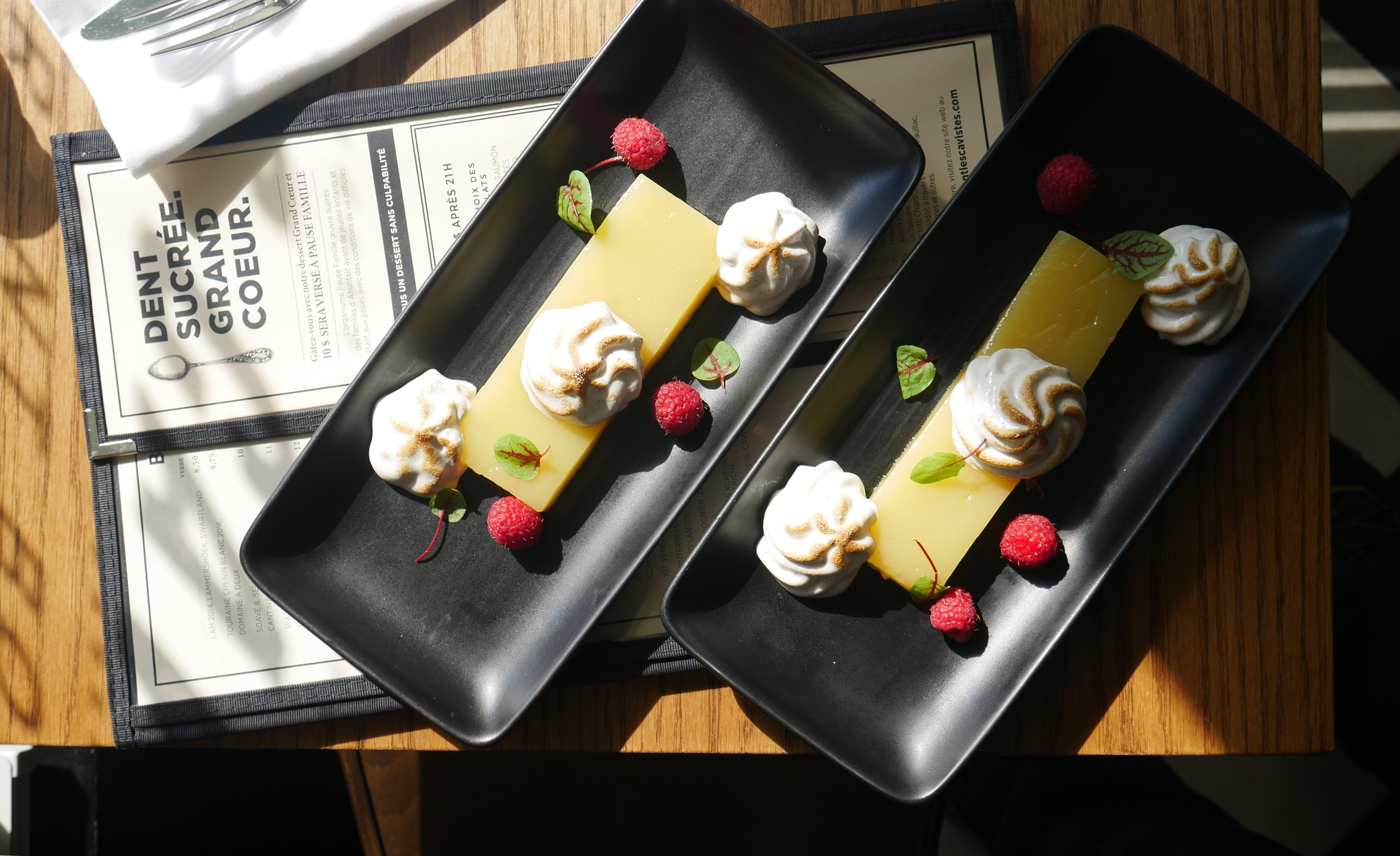 Dessert grand cœur au restaurant Les Cavistes, 196 Rue Fleury Ouest. Crème de citron avec meringues au poivre rose et framboises, décorée de feuille d’oseille sanguine. 13$ dont 10$ reversés à Pause Famille.