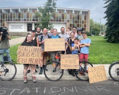 Afin de dénoncer l’occupation de cette bande pour vélos, souvent encombrée par des fidèles qui y stationnent leurs véhicules le jour de la messe, plusieurs cyclistes ont participé à un sit-in dimanche matin, orchestré par le collectif Vélorution Montréal.