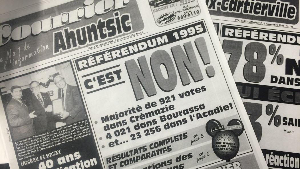 «C’est non!» titrait le Courrier Ahuntsic du 5 novembre 1995 à propos du référendum pour l’indépendance du Québec. «Oui écrasé», précisé le Courrier Bordeaux-Cartierville de la même journée.