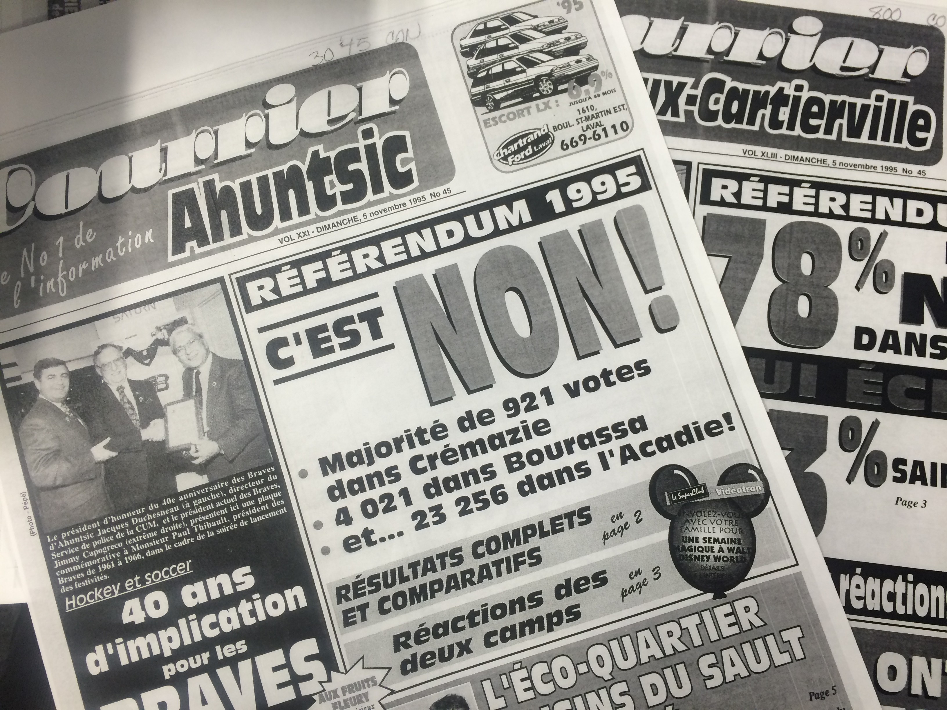 «C’est non!» titrait le Courrier Ahuntsic du 5 novembre 1995 à propos du référendum pour l’indépendance du Québec. «Oui écrasé», précisé le Courrier Bordeaux-Cartierville de la même journée.