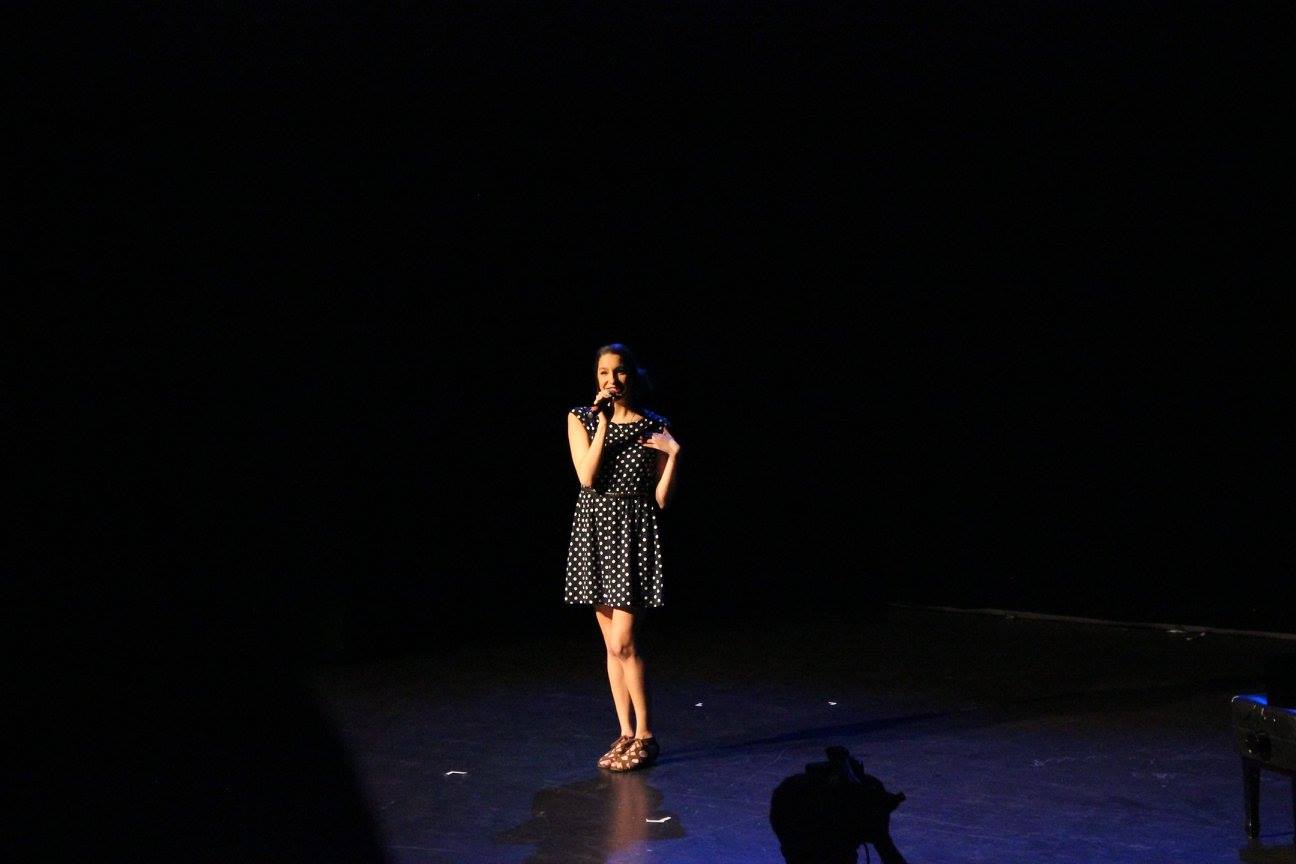 Durant huit minutes, la jeune femme de 20 ans vêtue d’une simple robe à pois s’est présentée seule sur scène, sans décors ni artifices, pour faire rire et réfléchir les spectateurs, principalement composés d’étudiants.
