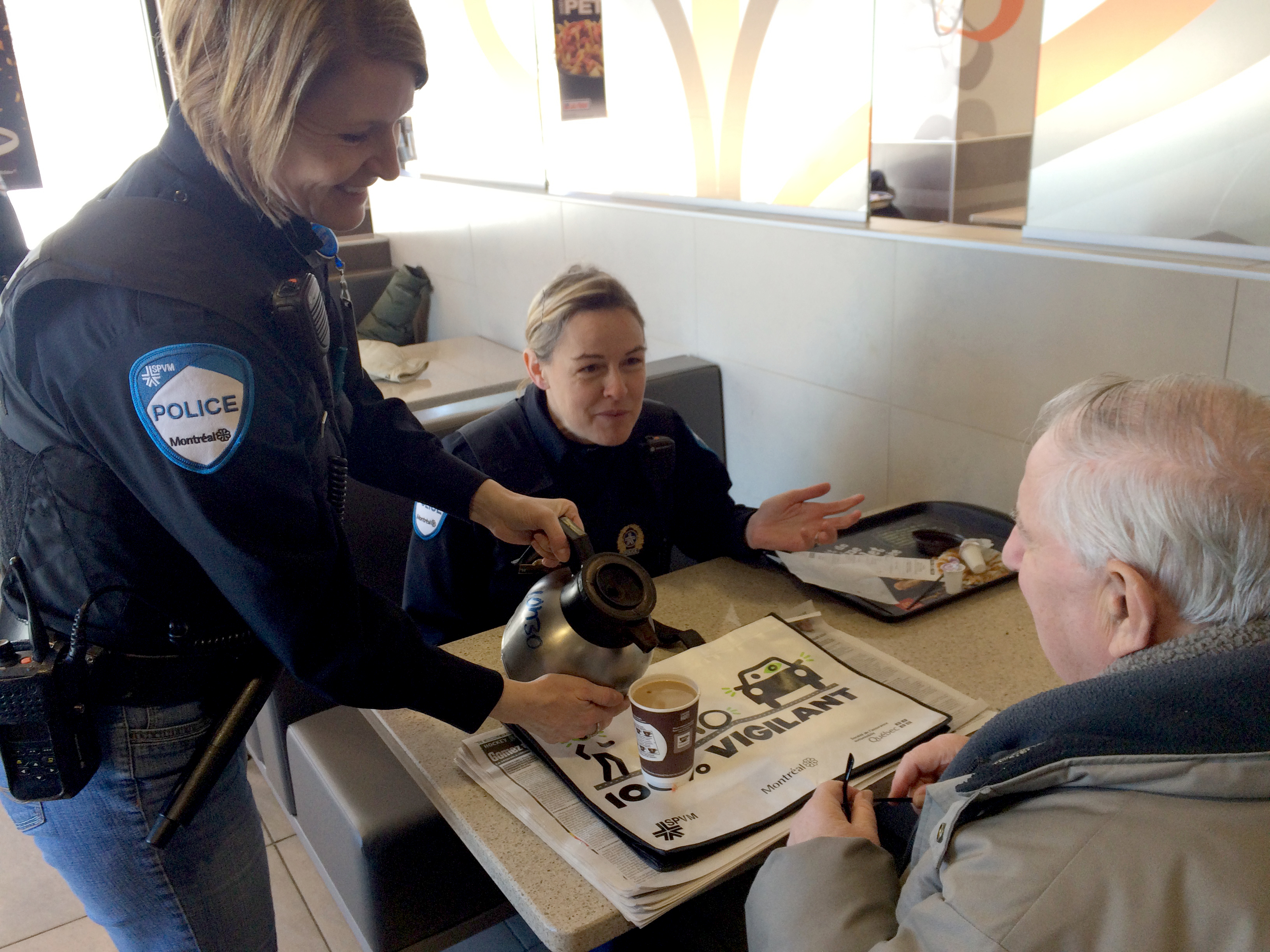 Une dizaine de policiers ont rencontré de façon informelle des citoyens d’Ahuntsic le jeudi 3 mars. Autour d’un café, ils ont échangé notamment avec plusieurs aînés sur la sécurité et diverses problématiques du secteur.
