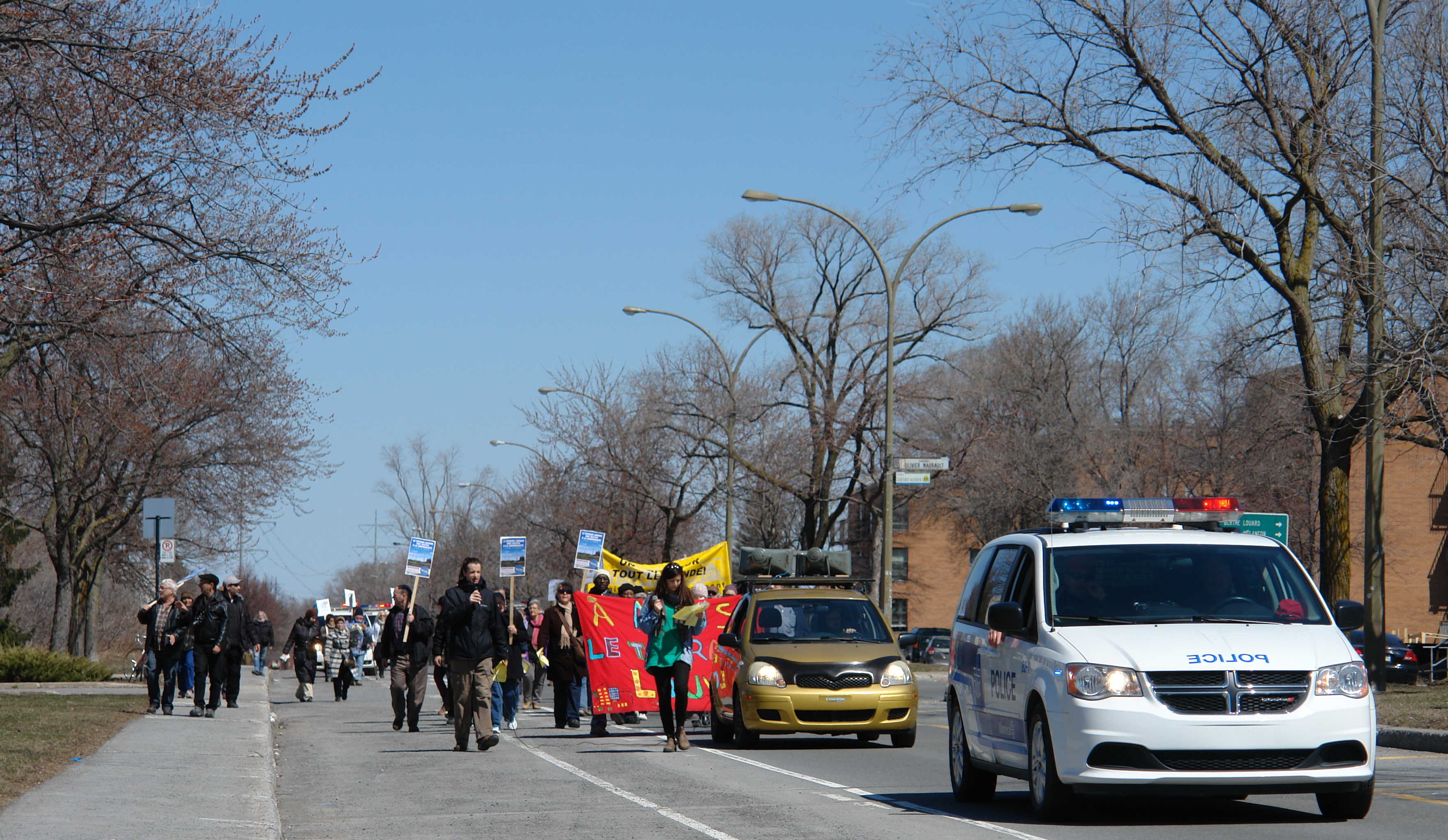 Une cinquantaine de personnes ont marché dans les rues d’Ahuntsic, jeudi, pour attirer l’attention des élus afin qu’un terrain d’une cour de voirie désaffectée serve à la construction de logements sociaux.
