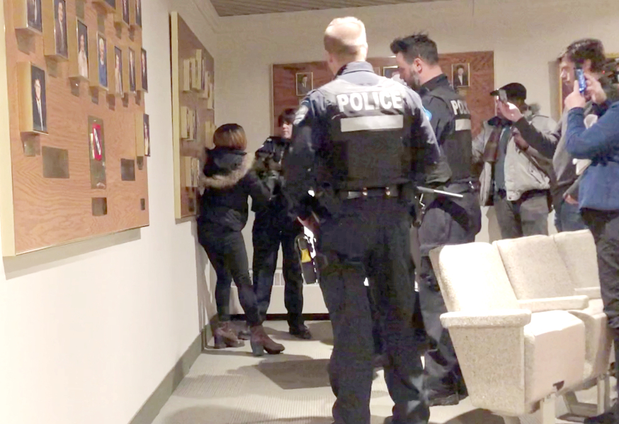 Les forces de l’ordre sont rapidement intervenues, sous les yeux de quelques journalistes et une trentaine de citoyens. Madame Boursiquot a été sortie bruyamment, mais n’a pas été arrêtée par les agents.