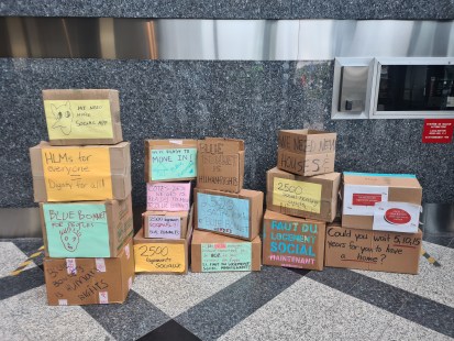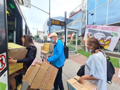 Pour faire savoir que les organismes et habitants sont prêts à «faire leurs cartons» et à déménager dans des logements sociaux à Blue Bonnets, à l’issue de la réunion de mardi, une quinzaine de militants s’est ensuite rendue à la mairie d’arrondissement de Côte-des-Neiges–Notre-Dame-de-Grâce pour y déposer des cartons sur lesquels on pouvait lire différents slogans, comme «nous avons besoin de maisons» ou encore «dignité pour tous».
