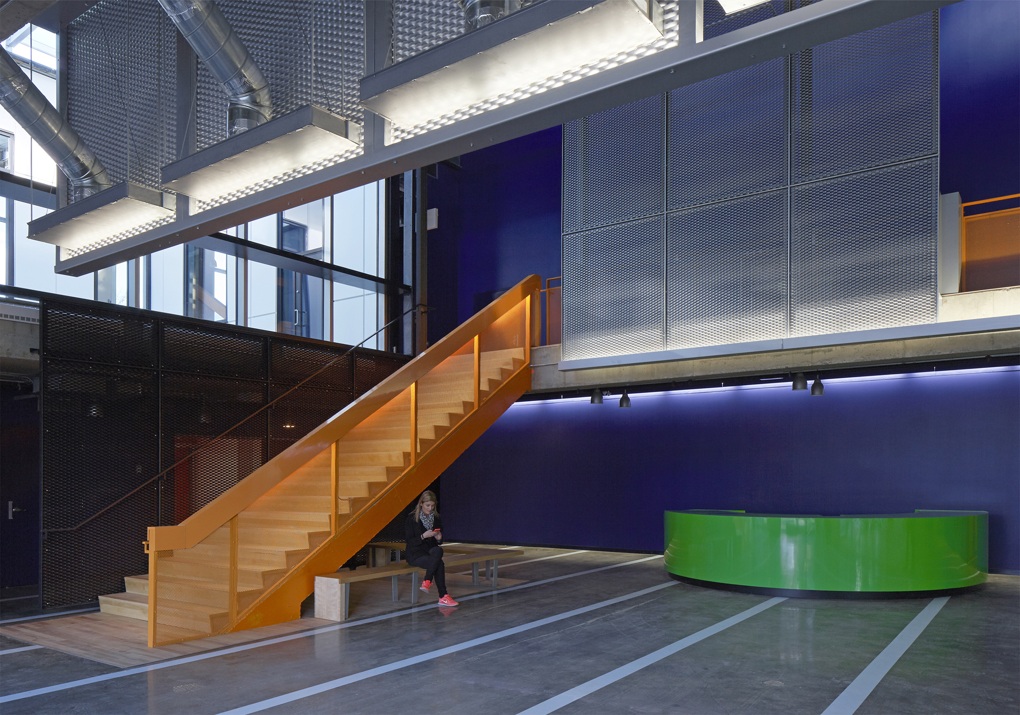 Mais ce qui frappe avant tout dans cette nouvelle adresse culturelle, outre ses qualités spatiales, c’est le cran des architectes, qui n’ont pas lésiné sur l’utilisation de couleurs vives pour égayer le lieu. Le bleu, le vert, l’orangé et le jaune s’entremêlent dans l’espace, à l’image d’un cube Rubik’s géant qu’on aurait volontairement mélangé.