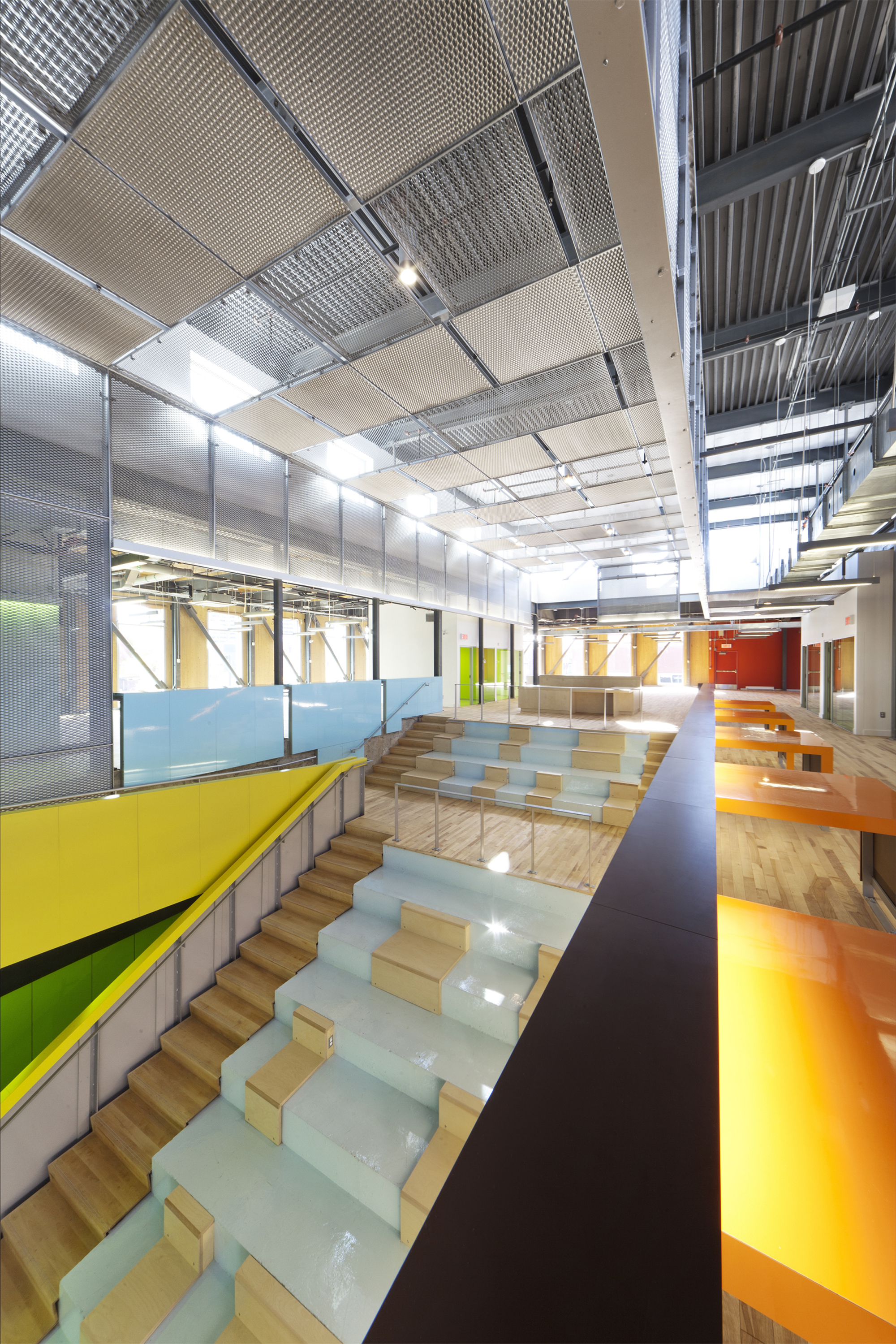 «La couleur fait partie de l’ADN de notre bureau [Atelier Big City], m’explique un des architectes qui ont chapeauté le projet, Randy Cohen. Ici, dans le centre, la couleur devient un code pour définir les espaces. Le bleu nuit, c’est la salle de spectacle. Le vert, c’est la bibliothèque. C’est une forme de signalétique.»