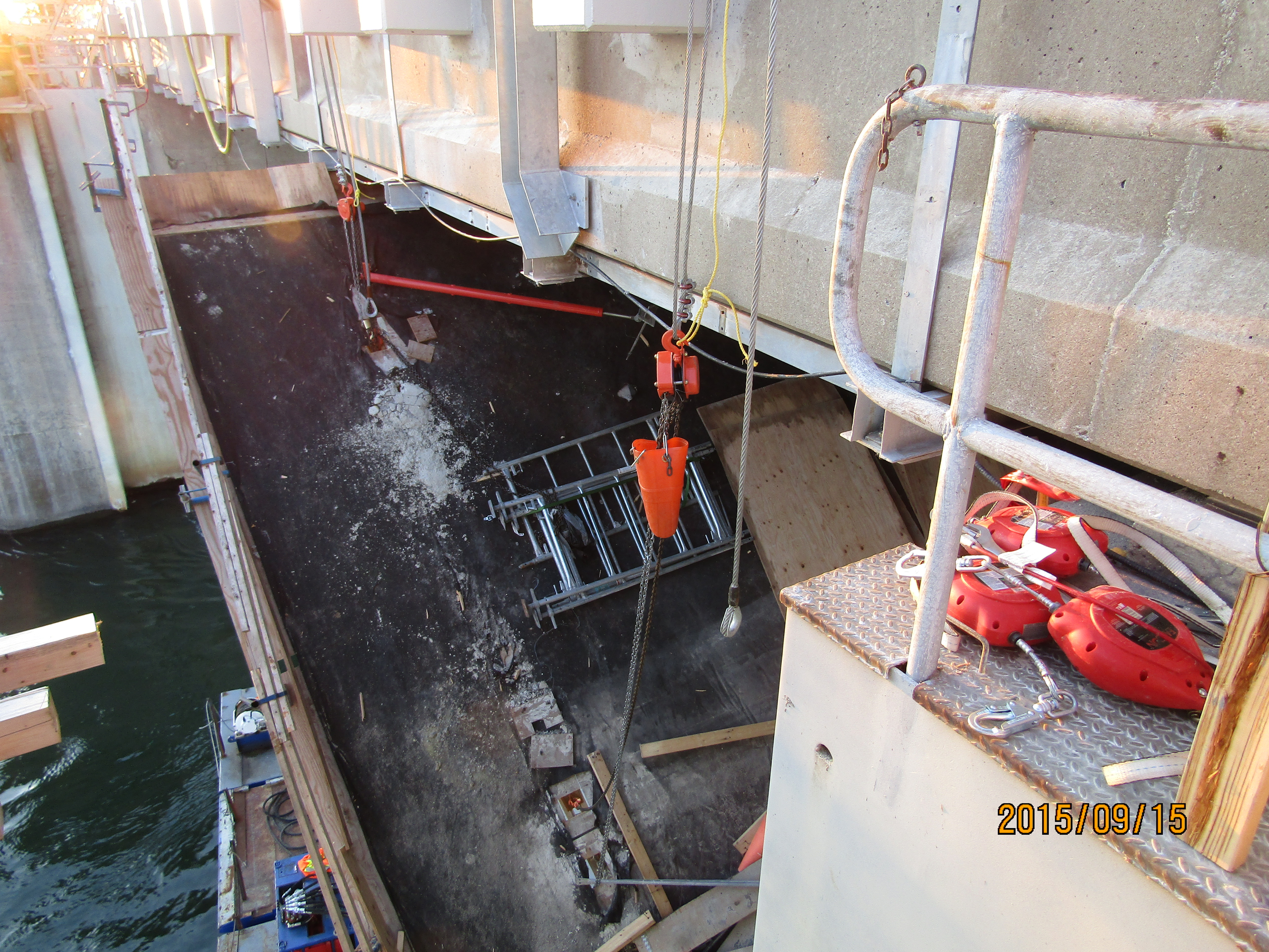 Le 15 septembre 2015, le contremaître et ses cinq ouvriers doivent enlever quatre plateformes de travail utilisées sous l’Estacade. Un peu avant midi, ils installent sur une des plateformes des palans, un système de poulies avec une chaîne qui servent à tenir la structure pour la descendre dans une barge sous l’Estacade près de la pile #9.
