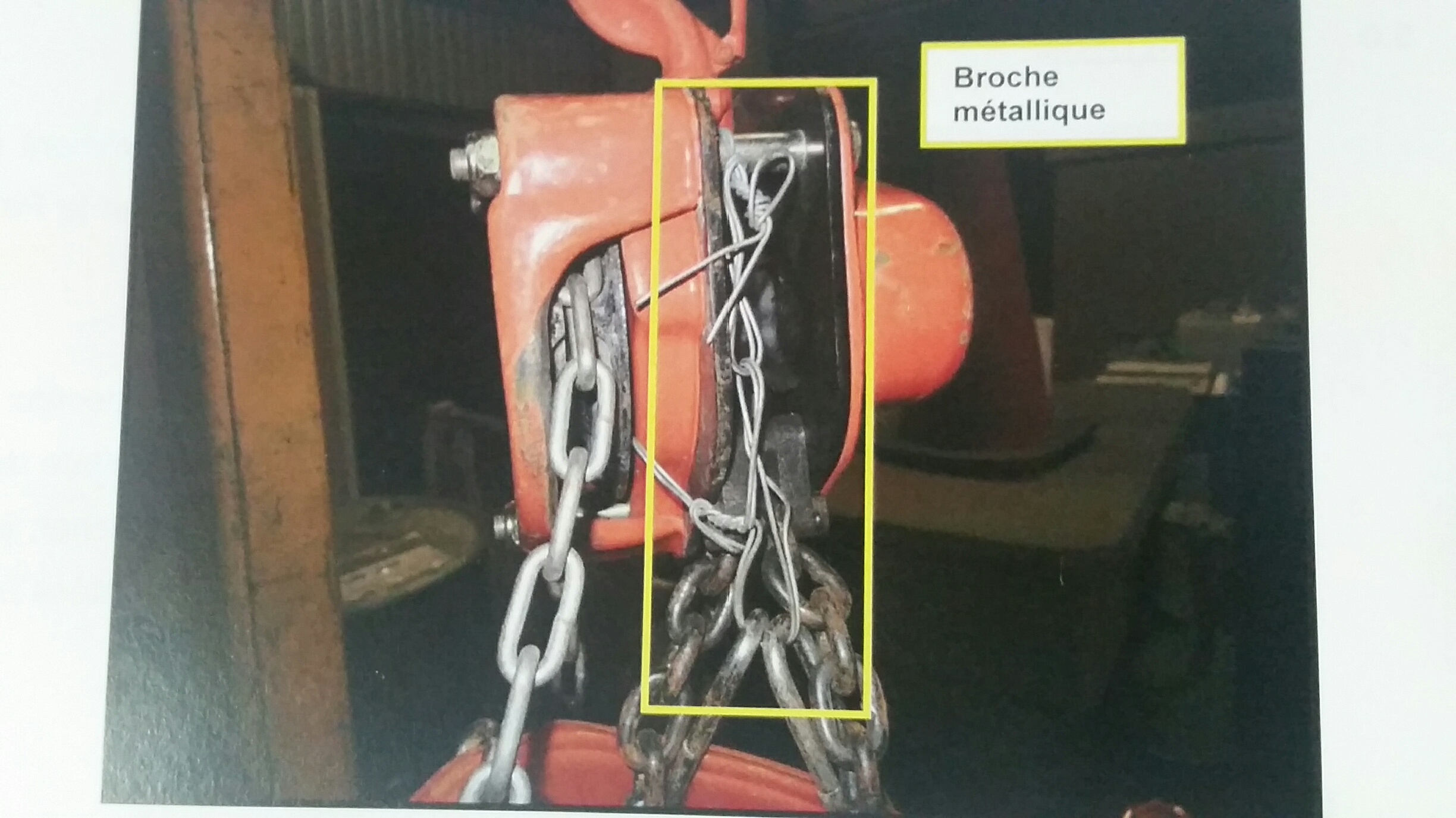 Il est également possible qu’une anomalie dans le palan ait contribué à son blocage. Un des paniers à récupération de chaîne était rafistolé avec de la broche, ce qui est contraire aux directives du manufacturier des palans et aux normes de sécurité de la CNESST.