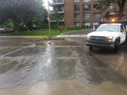 En matinée, des clôtures interdisaient l’accès de la rue où une bonne quantité d’eau jaillissait d’un grand trou. C’est la corrosion de certains tuyaux en face du Condominium Le 200 qui a entraîné ce bris d’aqueduc.