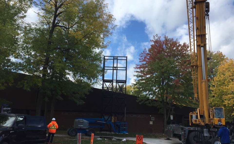 Après des mois d’attente, l’aménagement du premier clocher devant l’église de Sainte-Marguerite-Bourgeoys a commencé à prendre forme avec l’installation de deux tours noires et de quatre cloches, mardi matin.