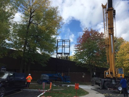 Après des mois d’attente, l’aménagement du premier clocher devant l’église de Sainte-Marguerite-Bourgeoys a commencé à prendre forme avec l’installation de deux tours noires et de quatre cloches, mardi matin.