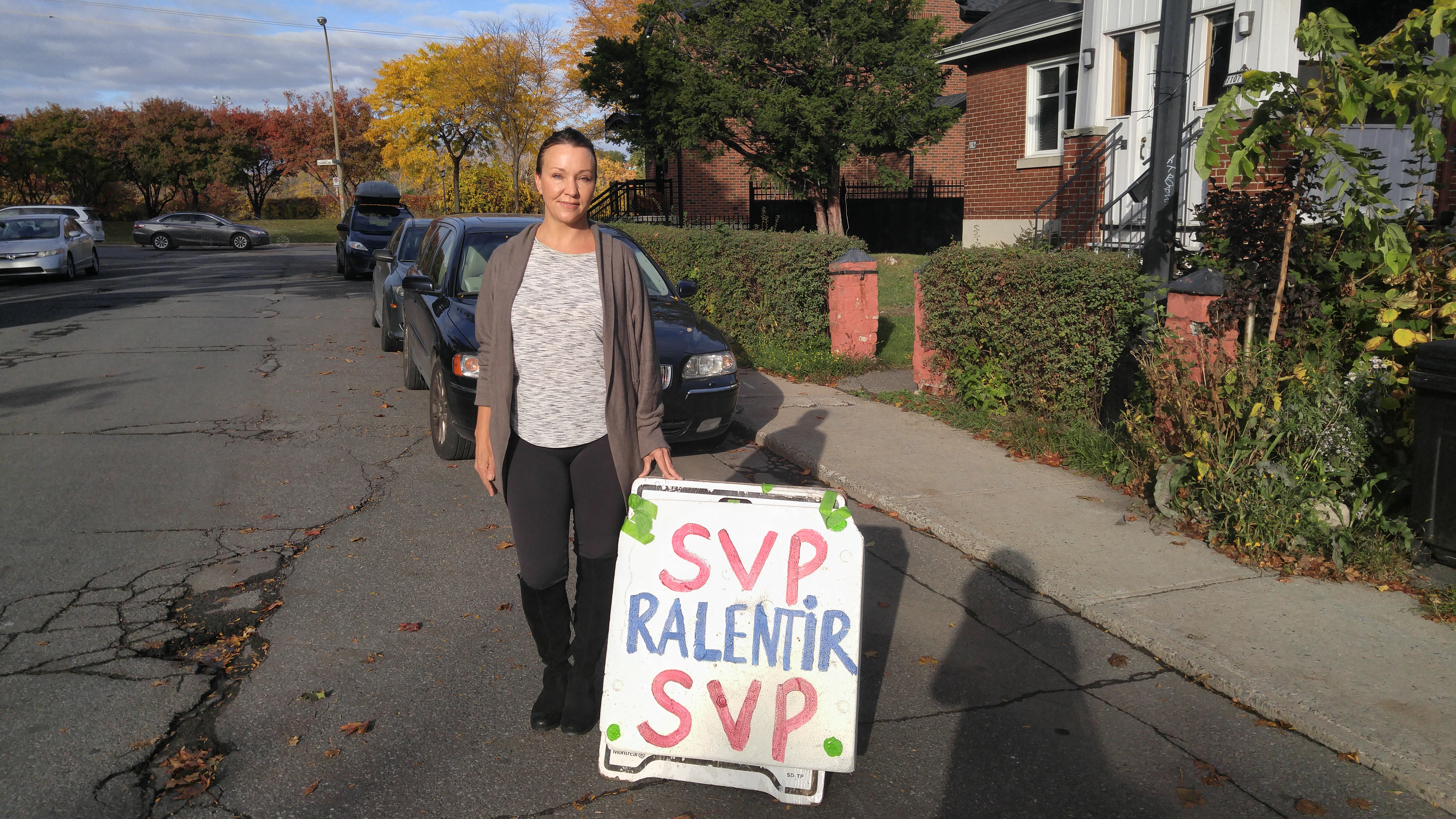 Erica Feininger n’en pouvait plus de voir les voitures rouler à toute vitesse devant chez elle. Après avoir interpellé l’arrondissement à plusieurs reprises, elle a fabriqué elle-même une pancarte «S.V.P. Ralentir».