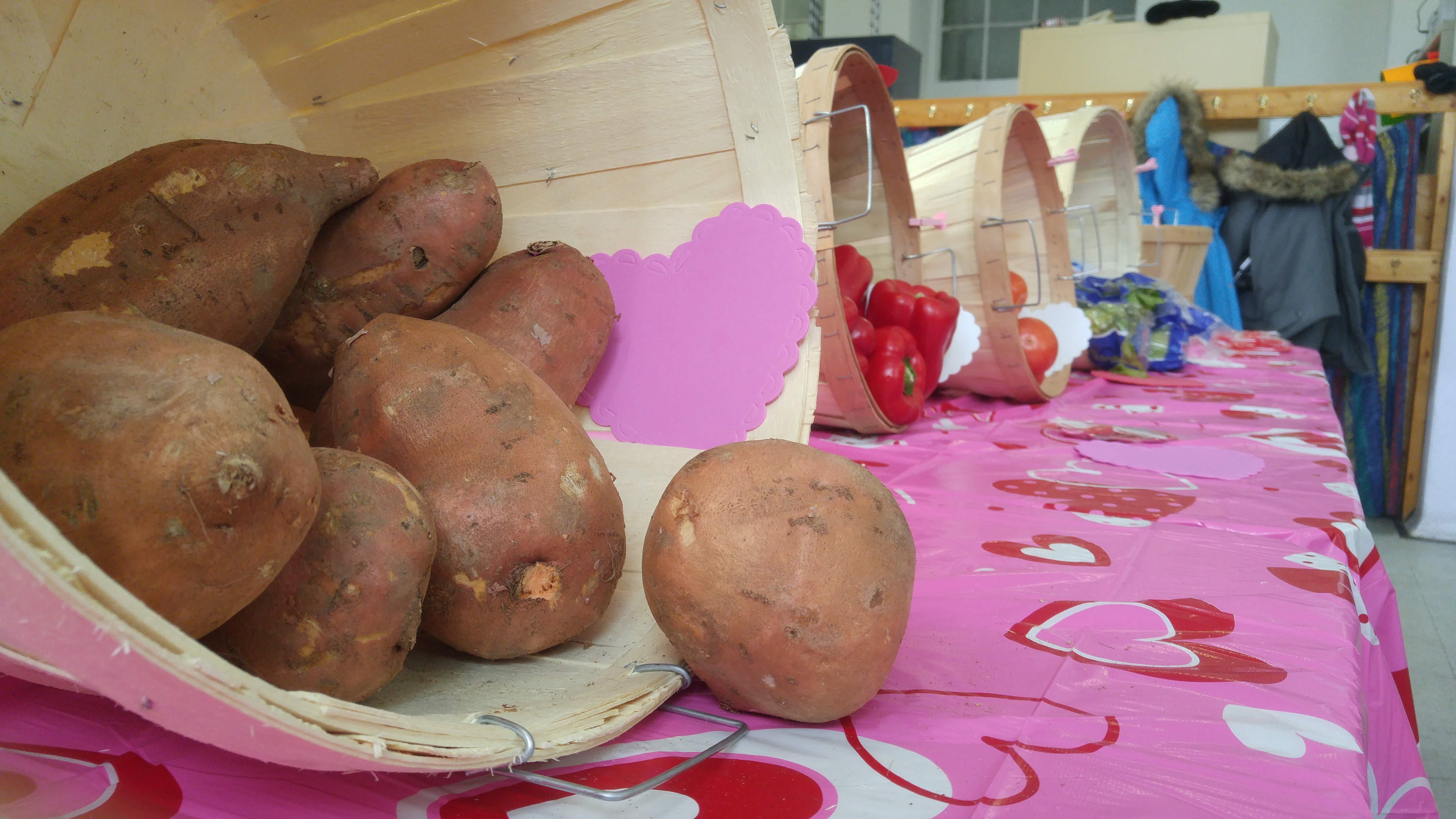 À côté de la grande table communale, Sheila Morrison et Maurice Tringle installent leur marché. Des choux de Bruxelles, des carottes, des pommes remplissent les paniers.