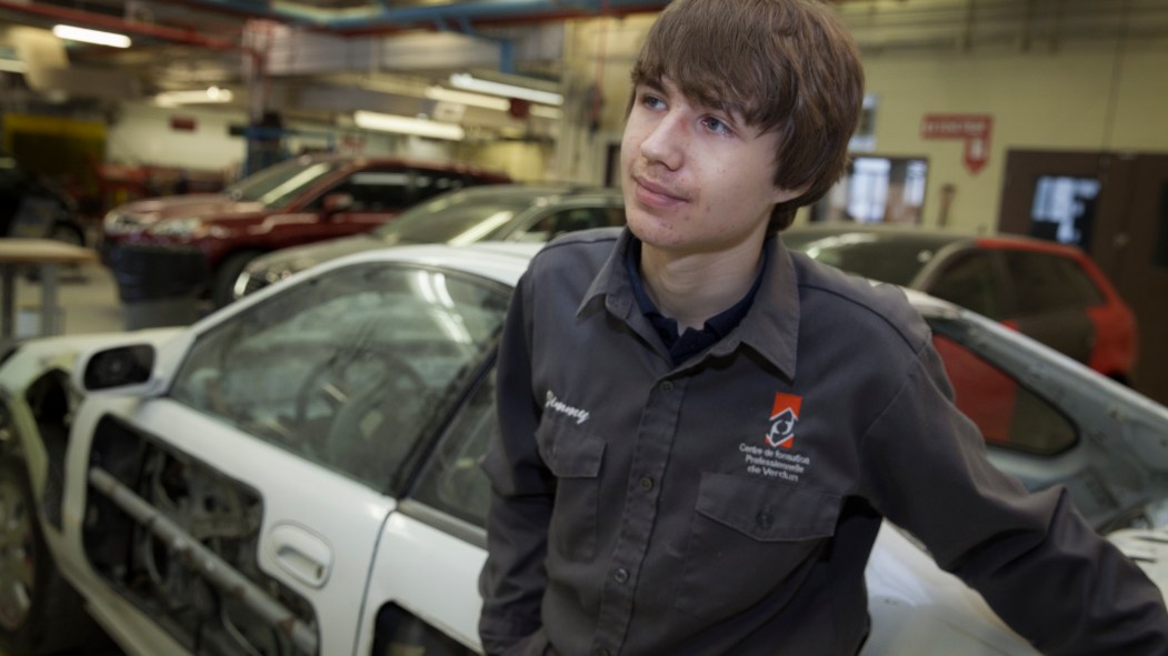 Depuis un peu plus d’un an, Jimmy Bonneau poursuit ses études secondaires au rythme des coups de marteau sur la tôle. Étudiant en carrosserie automobile, il peut en même temps terminer son diplôme général grâce à un programme de concomitance de la Commission scolaire Marguerite-Bourgeoys (CSMB).
