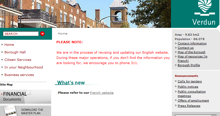 Depuis 2012, la version anglaise du site web de l’arrondissement Verdun est en construction. À la une, la nouvelle de la retraite du maire Trudel marque le décalage. Mais au-delà de l’aspect cocasse, l’absence d’informations pour les citoyens unilingues anglophones inquiète certaines personnes de la communauté.