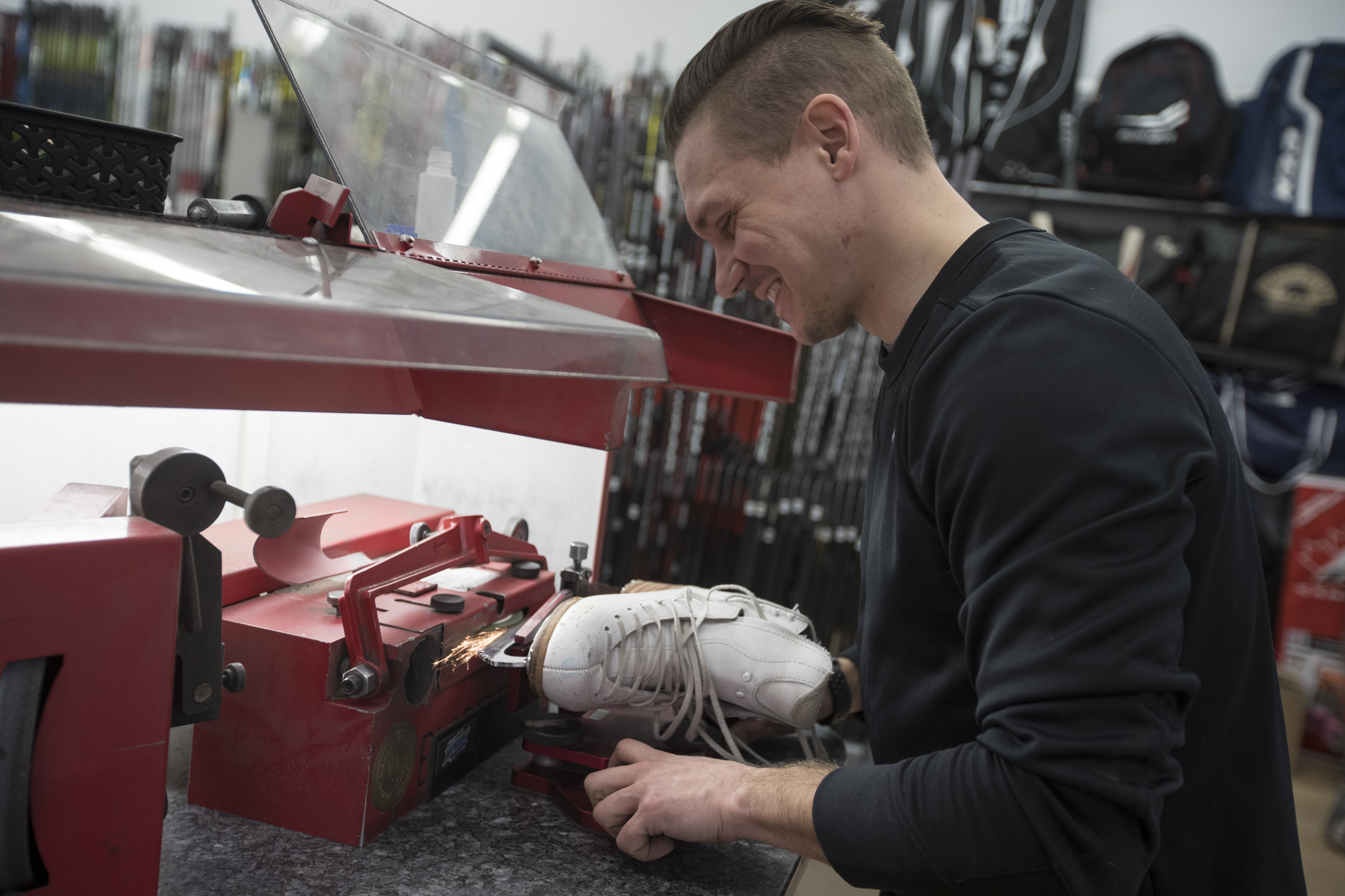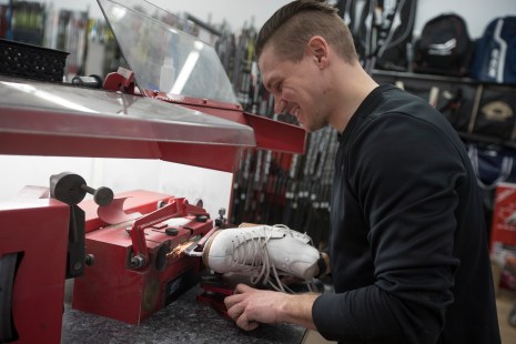 Le professionnel âgé de 29 ans réalise environ 150 aiguisages par semaine. Il parle de son métier comme d’une occasion de parler de ce qu’il aime, même s’il n’a pas réussi à percer au hockey.