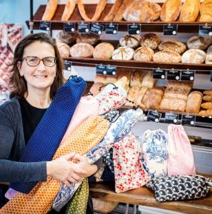 Je fais tout, donc c’est pour cela que c’est important pour moi de sous-traiter la production. J’ai acheté beaucoup de pain à une époque pour avoir une taille idéale de sac qui pourrait contenir tant un pain carré qu’un ovale, ou encore une petite miche. J’ai fait la même chose pour la baguette et il y a ensuite le choix du tissu, 100% coton et doublé. J’utilise également de la toile de Jouy [une étoffe de coton] pour les sacs à bouteille et les napperons.