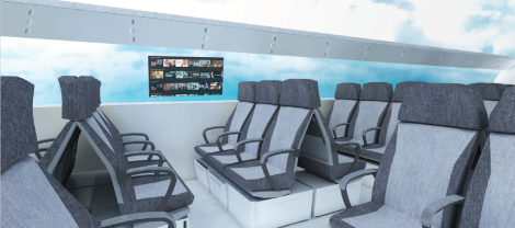 Mélissa Caron-Labrecque a quant à elle conçu la cabine avec des sièges placés face à face pour agrandir la surface d’écran entre les rangées. Les bagages ne seraient plus dans les porte-bagages au plafond. Samuel Théberge a plutôt imaginé les installer sous les sièges, dans des espaces cloisonnés.