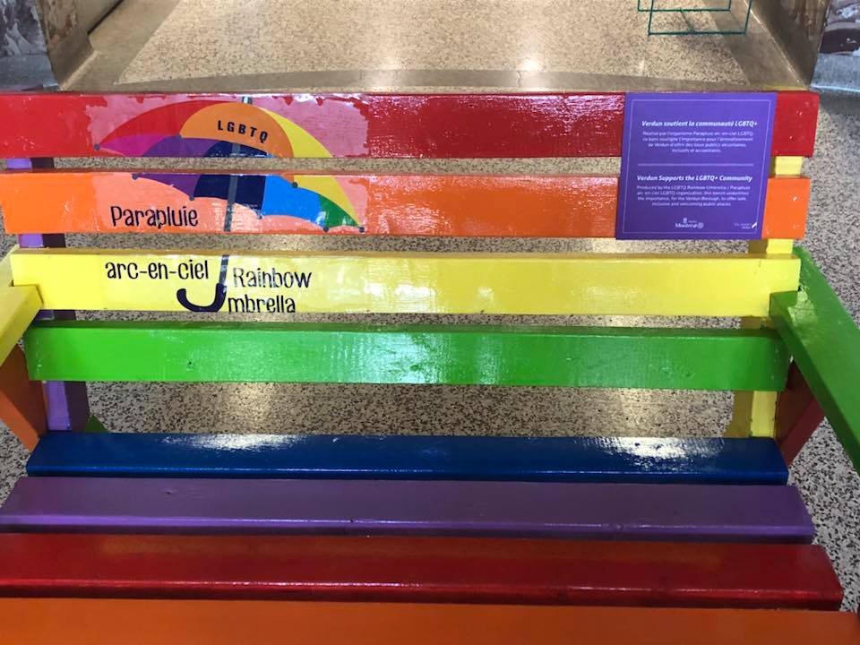 Dans le cadre de la Journée internationale contre l’homophobie et la transphobie, un banc a été inauguré dans la mairie d’arrondissement de Verdun. Le mobilier a été conçu et peint par des élèves de l’Académie Beurling qui sont aussi membres de l’organisme Parapluie arc-en-ciel LGBTQ qui met en avant des jeunes d’orientation ou d’identité sexuelle différentes.