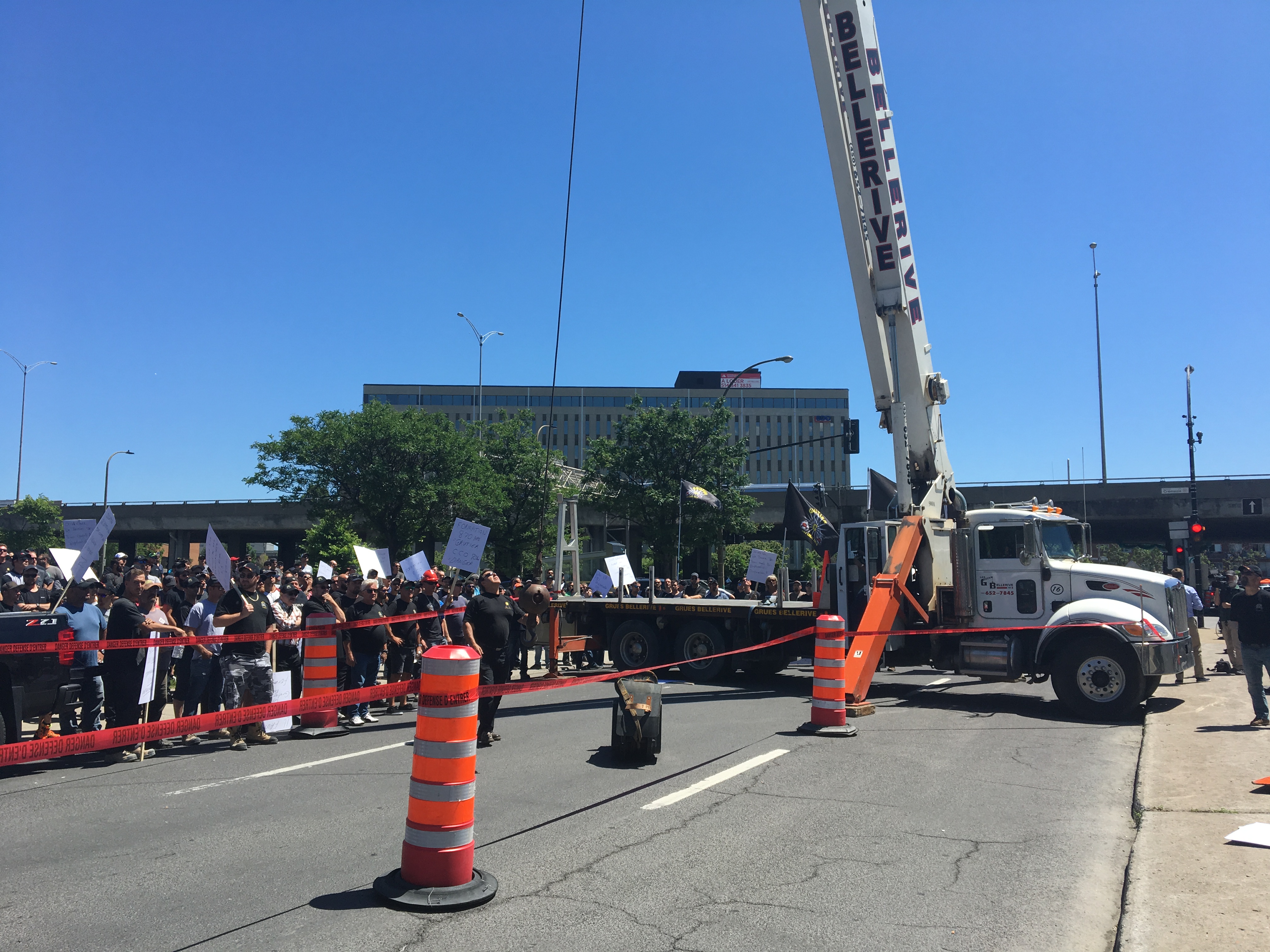 Des centaines de grutiers s’étaient rassemblés la semaine dernière devant les locaux de la Commission de la construction du Québec (CCQ), coin Christophe-Colomb et Crémazie, à Montréal, pour manifester leur mécontentement face aux modifications du règlement qui permet d’opérer des camions-flèche sans diplôme. Les nouveaux critères accordent le droit de manœuvrer cette machinerie lourde, composée d’une petite grue à l’arrière d’un camion, avec une formation de 80 heures en entreprise depuis le 14 mai.