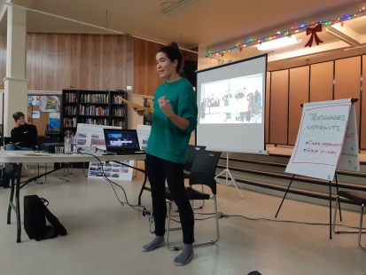 Claire Abraham, membre du comité droit au logement au Projet Genèse, est venue parler du terrain de l’ancien hippodrome Blue Bonnets dans l’arrondissement de Côte-des-Neiges — Notre-Dame-de-Grâce. Elle a évoqué trois types de stratégies : bâtir un rapport de force en montrant l’intérêt public, développer une vision pour le site et faire du lobbying auprès des élus. Elle a également parlé des défis, comme le maintien d’une lutte sur 20 ans, la création de moments réels forts et le manque d’alliés politiques surtout pour la création de logements sociaux.