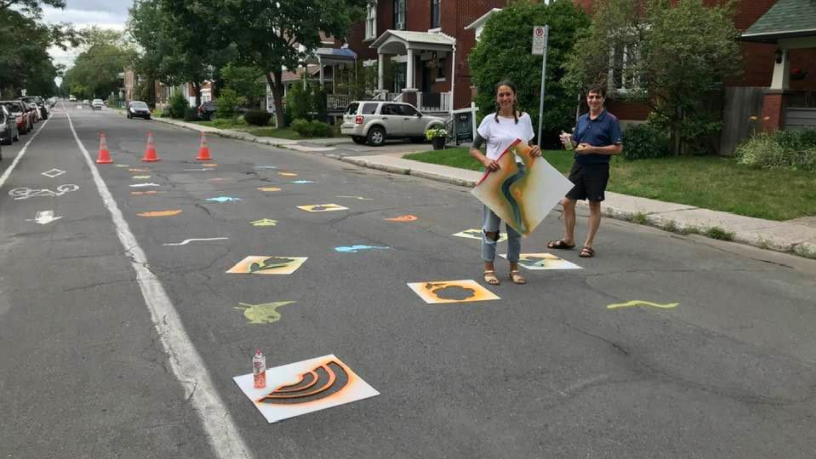 La Verdunoise et illustratrice Barbara Kraemer a créé des modèles de dessins afin que des gens du quartier peinturent sur des rues devenues piétonnes. Avec de grands pochoirs, des dizaines de citoyens ont participé à l’initiative en calquant sur le sol des images qui rappellent l’été.